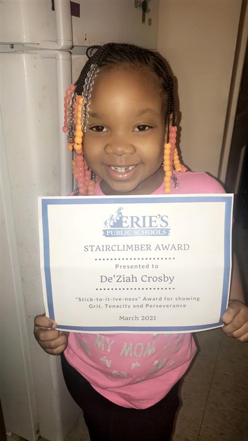 Erie's Public Schools strives to always celebrate the success of our students. As part of that initiative, the Stairclimber Award is presented monthly at regular School Board meetings (from October through May) to one student from each building, recognizing their tenacity, grit and perseverance toward making improvements in their ABC's -- Attendance, Behavior and Classroom Performance.