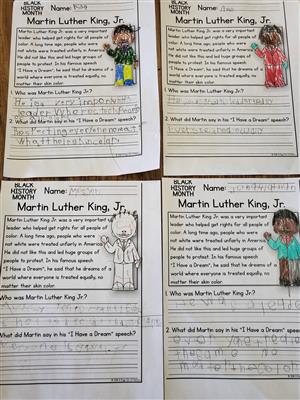 Students in Perry Elementary's kindergarten, first and second grade emotional support classroom "met" Dr. Martin Luther King, Jr. through learning and writing about King and one of his most famous and powerful speeches (right). In answer to the question of "What did Martin say in his 'I Have a Dream Speech," one student wrote, "Respecting everyone no matter their skin color."