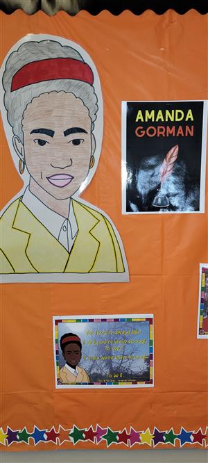 Jefferson Elementary SchoolA bulletin board made by 2nd grade teacher Jaime Walker features Amanda Gorman, the American poet and activist who spoke at President Joe Biden's inauguration. Walker's second grade class will watch Ms. Gorman's now famous inaugural speech and create their own poetry to be displayed in the halls outside their room.
