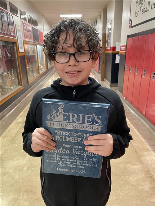 Erie's Public Schools strives to always celebrate the success of our students. As part of that initiative, the Stairclimber Award is presented monthly at regular School Board meetings (from October through May) to one student from each building, recognizing their tenacity, grit and perseverance toward making improvements in their ABC's -- Attendance, Behavior and Classroom Performance.